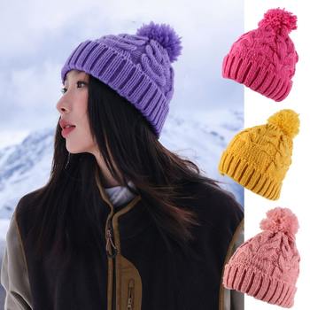 Women’s Winter Solid Color Warm Knitting Loose Beret Leisure Ski Cap Korean Version Beret Plus Velvet Thick Knitting Ear Cap